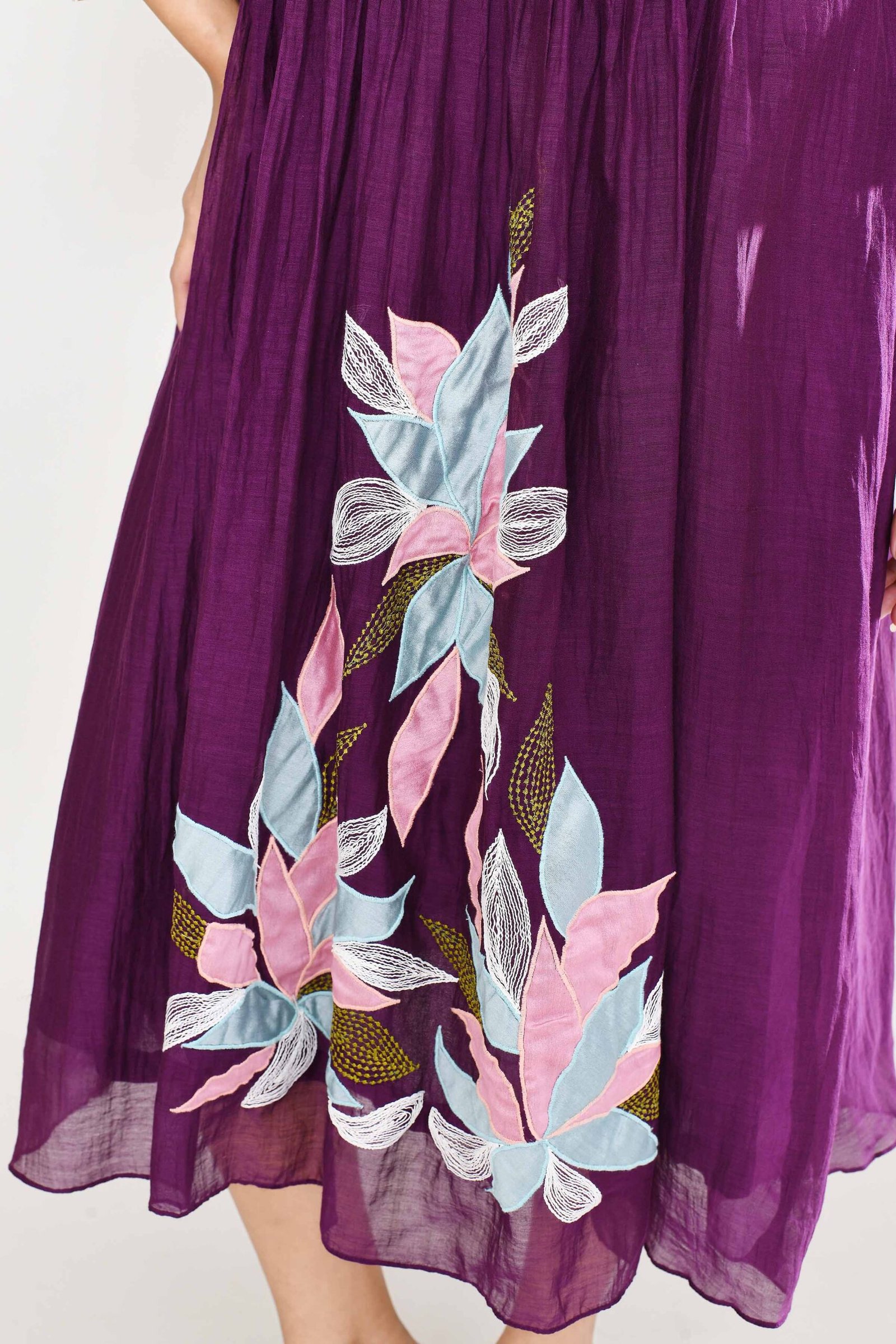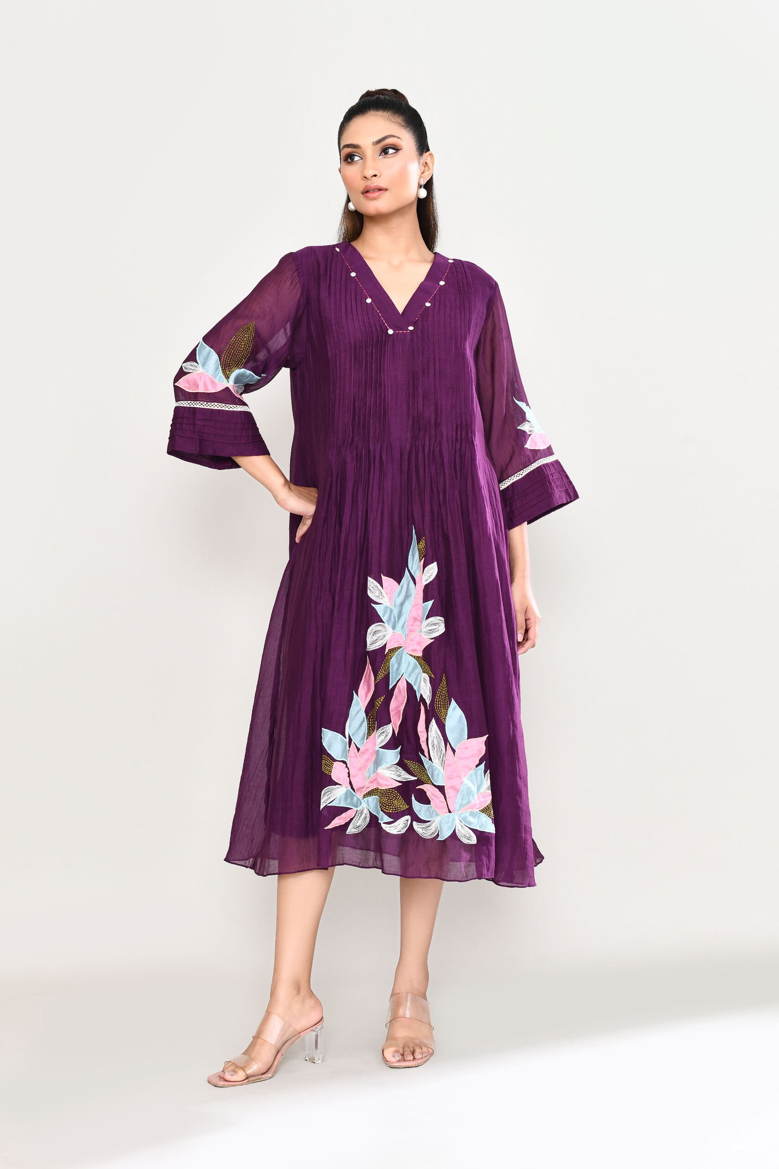 This elegant tunic is detailed with a simple V-Neck and the body and sleeves are heavily textured with fine vertical pleats . It features striking, applique work with floral and leaf motifs in muted colors on the lower front and on the three-quarter sleeves . This exquisite garment is a celebration of texture and artistry .