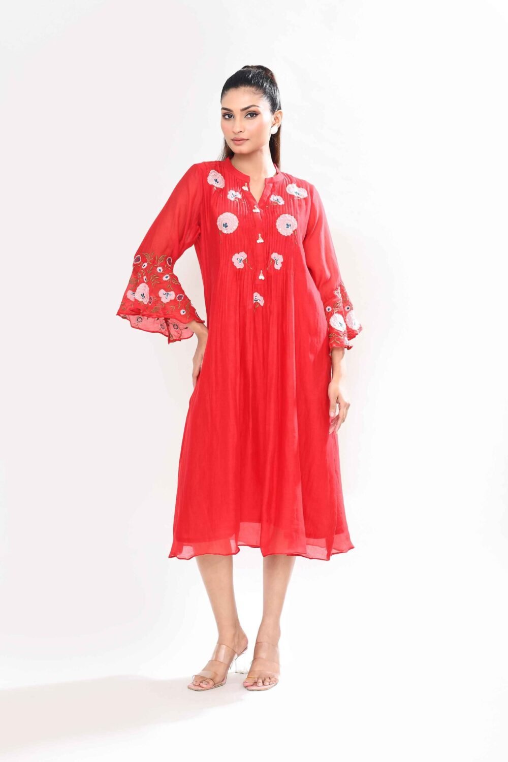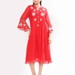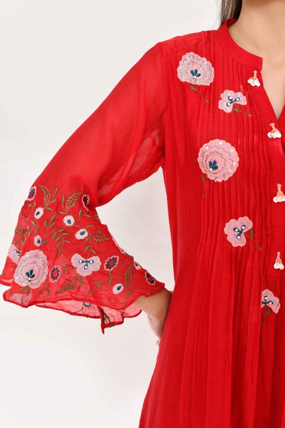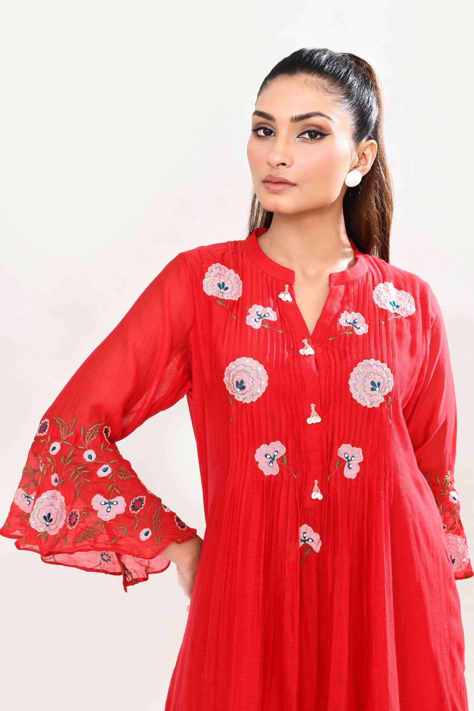 This mul chanderi tunic is adorned with intricate floral embroidery in shades of coral and peach, complemented by fine pintuck detailing. The highlight of the piece lies in its bell sleeves, beautifully embroidered with floral motifs that lend a romantic and contemporary touch .