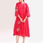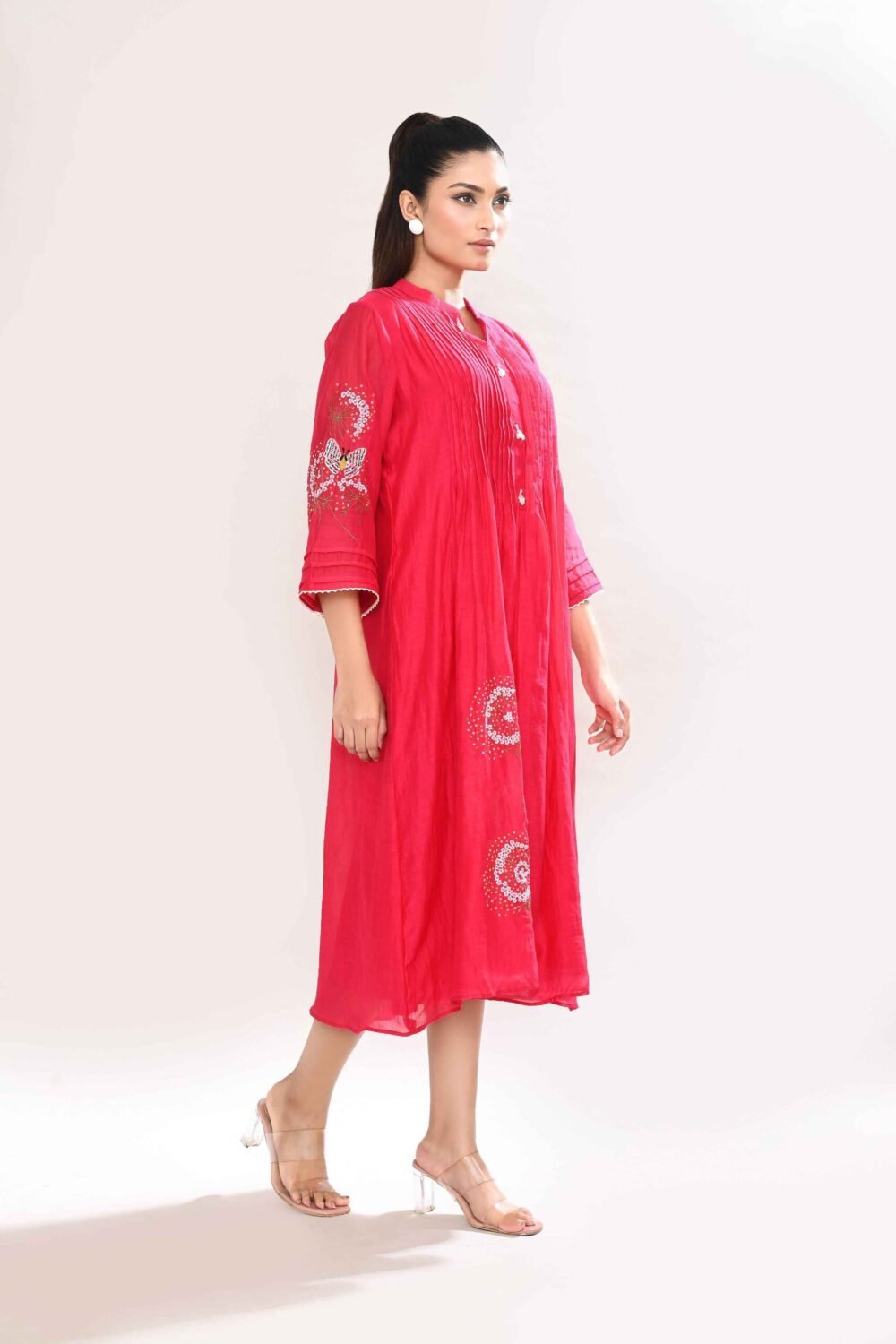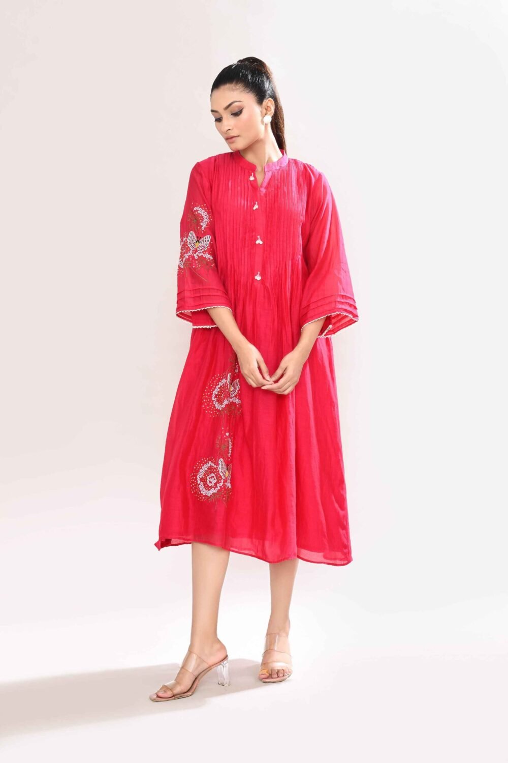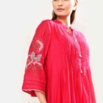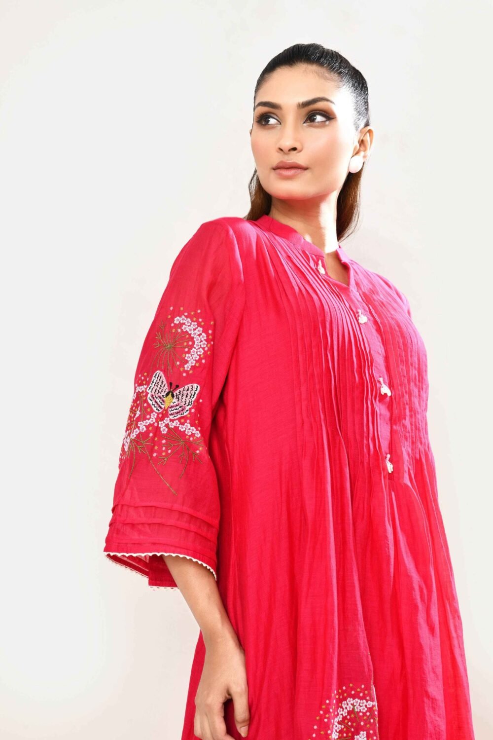 This tunic is crafted from mul chanderi fabric and is lightweight and has a subtle sheen. The tunic is presented in a deep, rich teal or emerald green color. The embroidery adds a whimsical, nature-inspired element and is the main focal pount of the garment. The body features extensive pin-tucks running from the shoulder down the front, creating a textured and flattering drape
