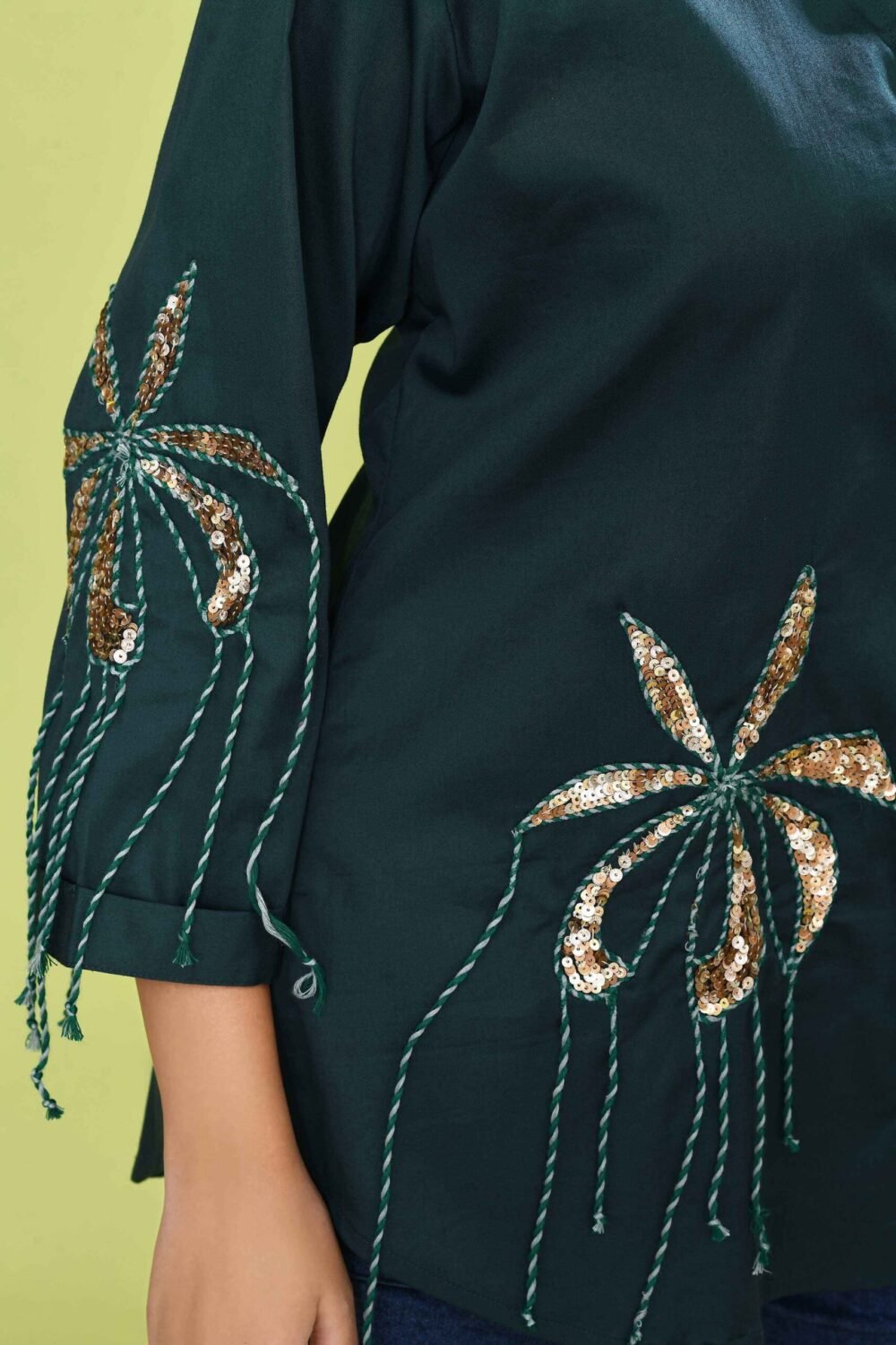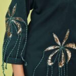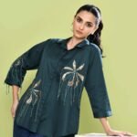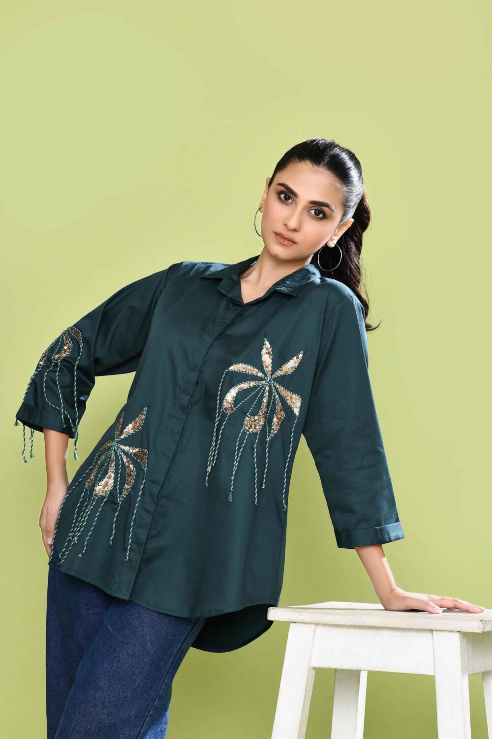 Tailored in pure stretch cotton, this shirt features a delicate hand-embroidered petal motifs, intricately detailed with sequins and soft twisted cords that add depth and shimmer. The 3/4 sleeves carry forward the same handwork motifs near the cuff. Twisted threads cascade gently from the embroidery, lending the shirt a subtle bohemian edge. The back of the shirt is elegantly tailored with soft gathers at the waist, accentuated by a structured buttoned tab that adds both defination and design interest.