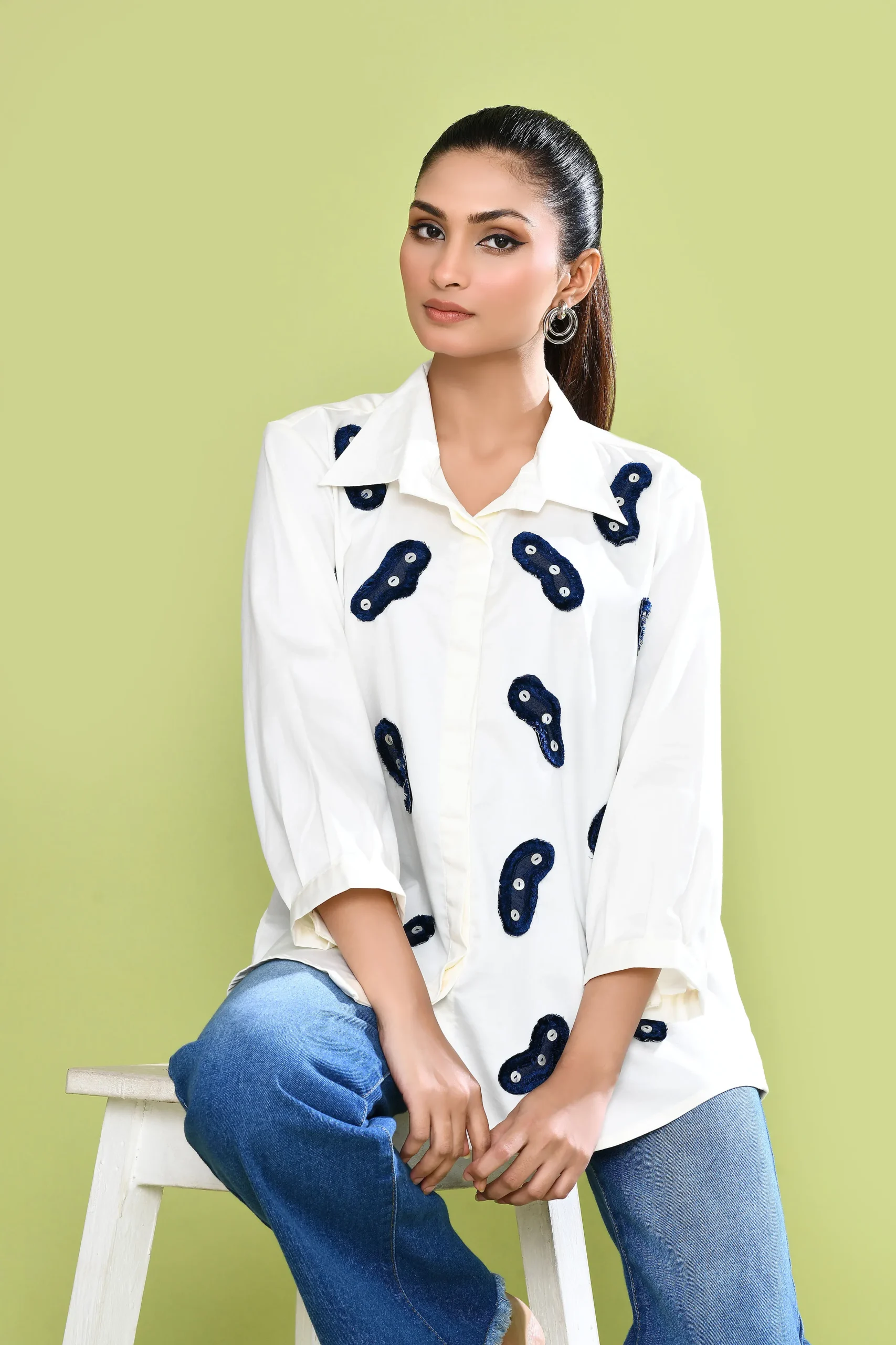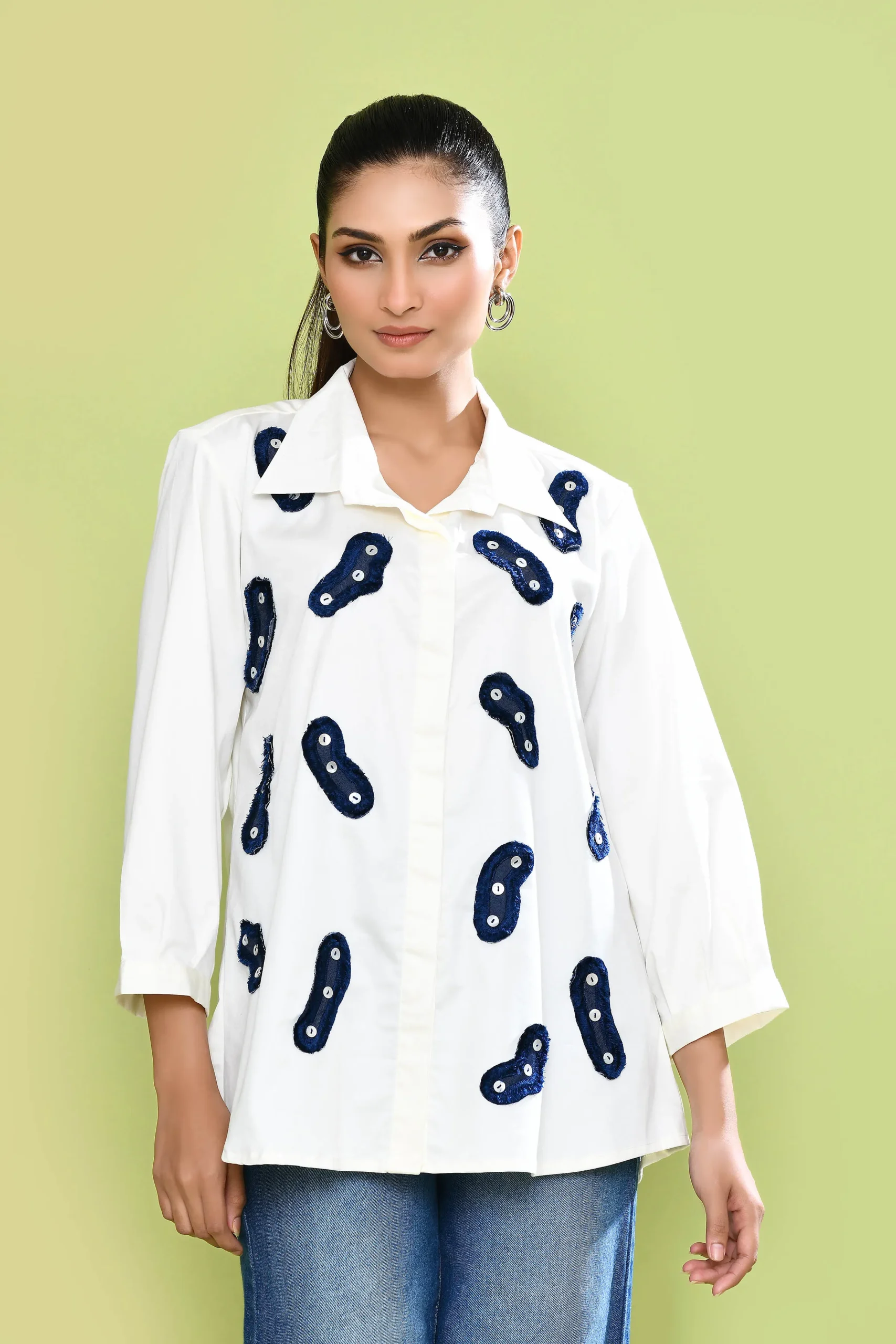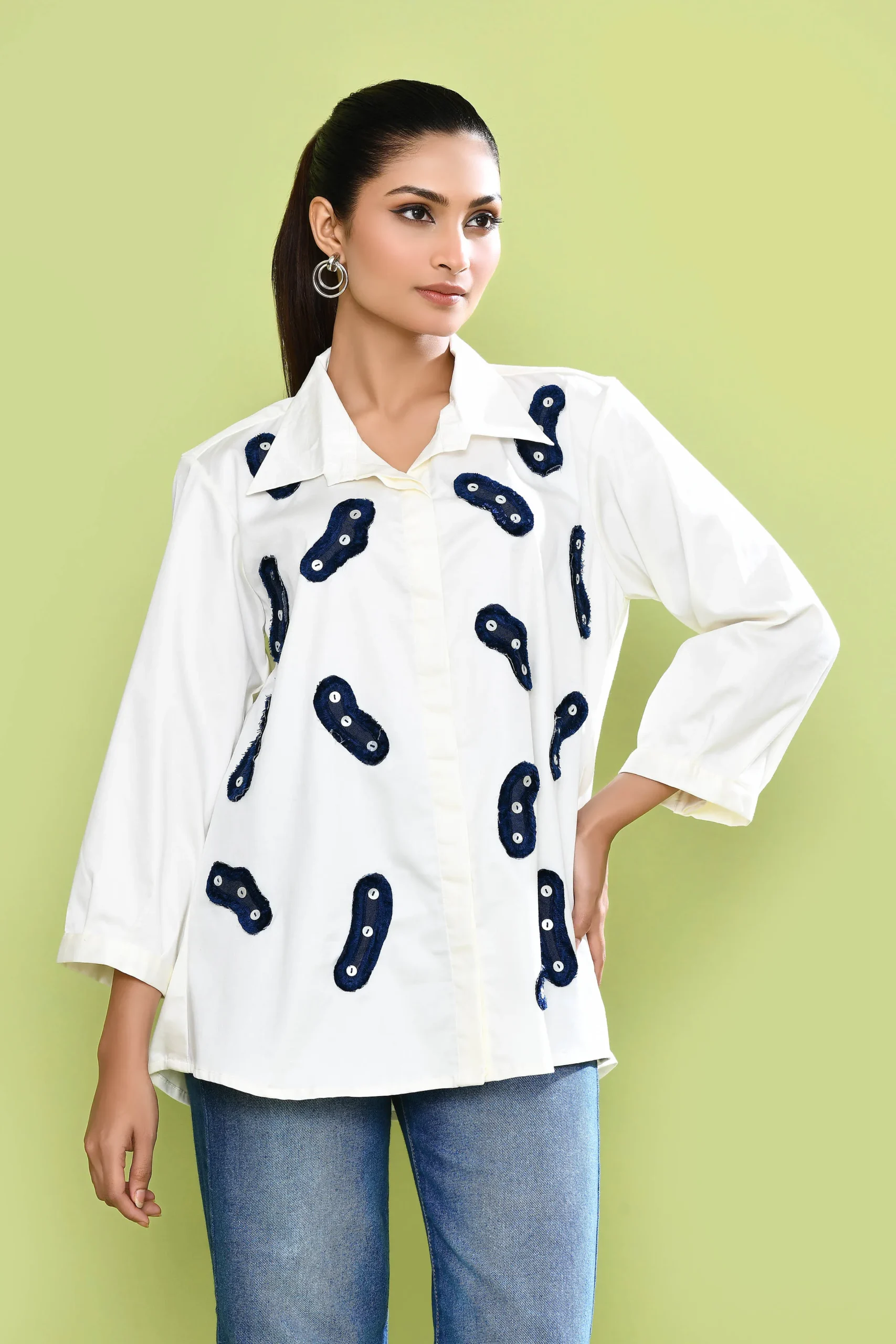 Made in pure stretch cotton, this shirt is adorned with hand-cut applique patches, each finished with delicate button detailling. Thoughtfully designed with a concealed front placket and a fluid silhouette.