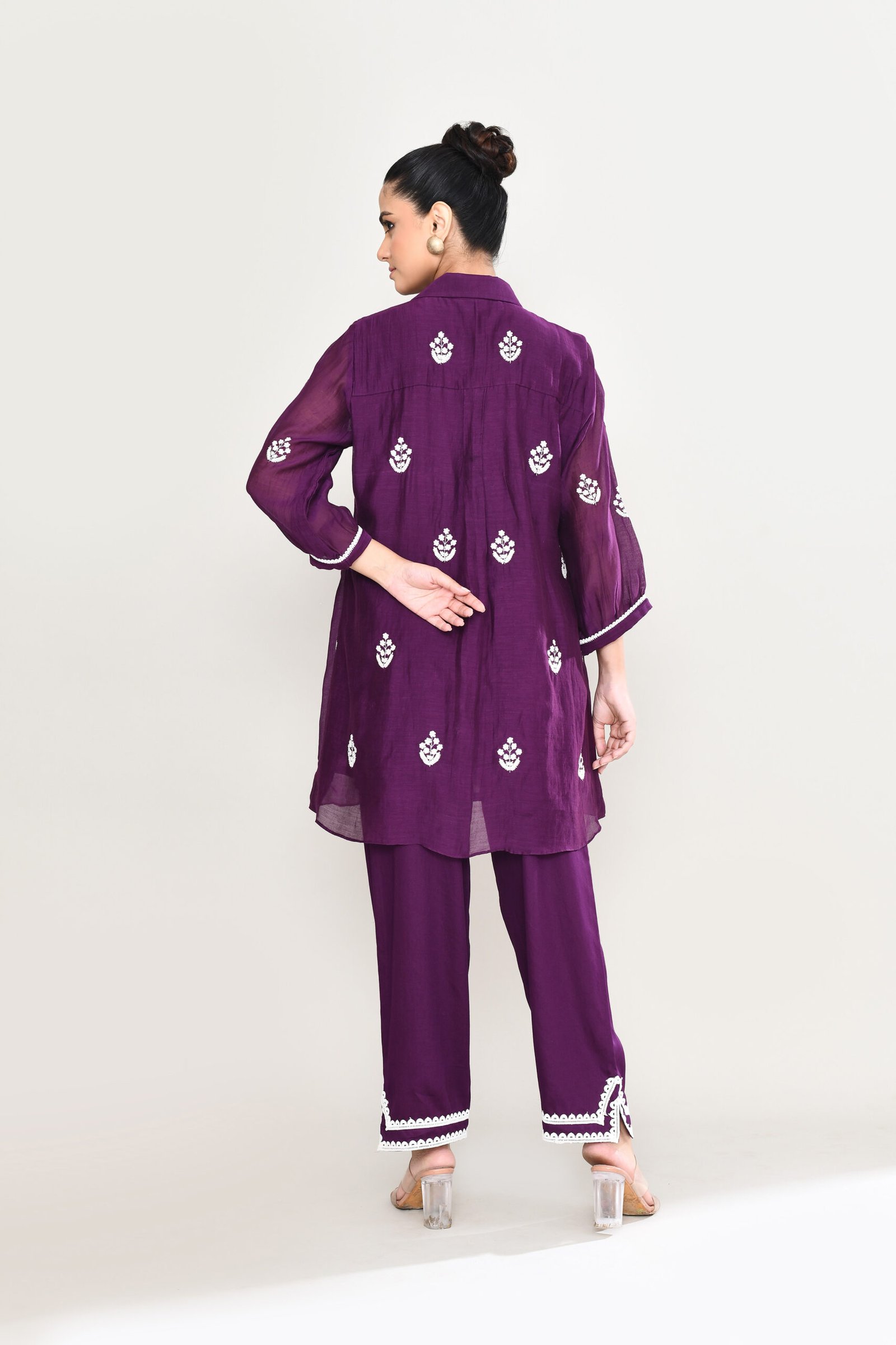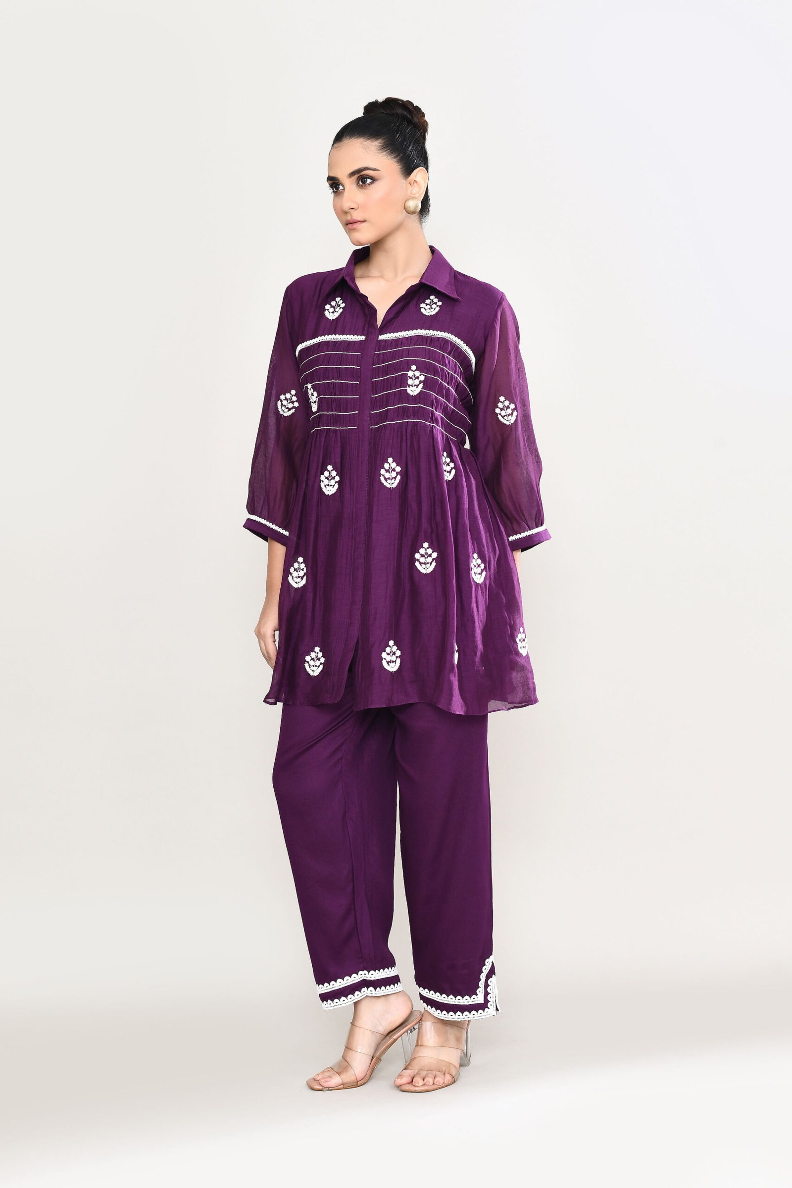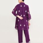 Discover the perfect blend of traditional charm and modern tailoring with our mul-chanderi co-ord set. The top features a pintucked yoke adorned with delicate white floral embroidery and comes with an attached inner. It is paired with matching pants that steal the show with double rows of scalloped lace and a chic pleated frill hem .
