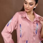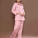 Breathe freshness into your style with this co-ord set that serves as a perfect canvas. Vertical lines of chevron-style embroidery run down the front panels and sleeves, showcasing a gradient of colour shades from deep fuchsia to soft blush-centered with subtle mirror-work accents. The set comes with matching pants made from the same fabric .